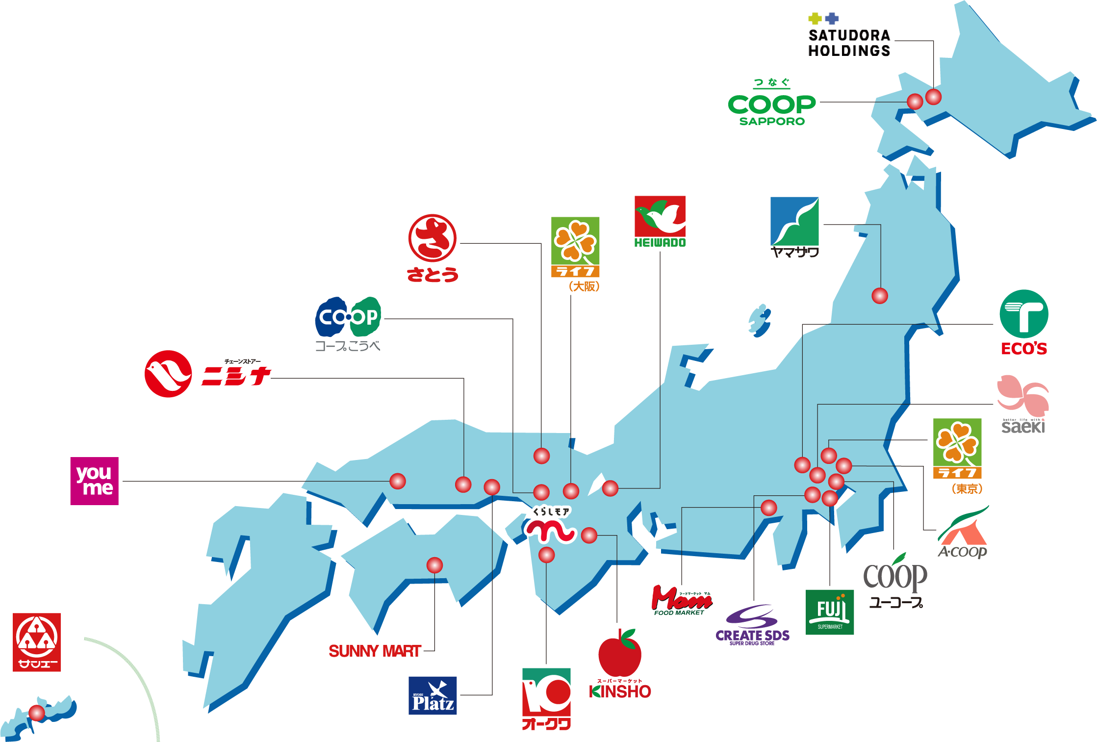 ニチリウグループは、全国各地の有力チェーンストア18社と、生活協同組合3協が結集し加盟各社はそれぞれ独自の経営理念を持ち、自主独立の精神を堅持しながらも、共同体としてのメリットを生かし、また相互にノウハウの交換をするなど、その持てる力を最大限に発揮しています。こうした強固なパートナーシップの結束は、そのまま各社の成長につながり、その事業規模において屈指の業容にまで拡大。加盟各社の発展と共に、ニチリウもまた飛躍を続けています。